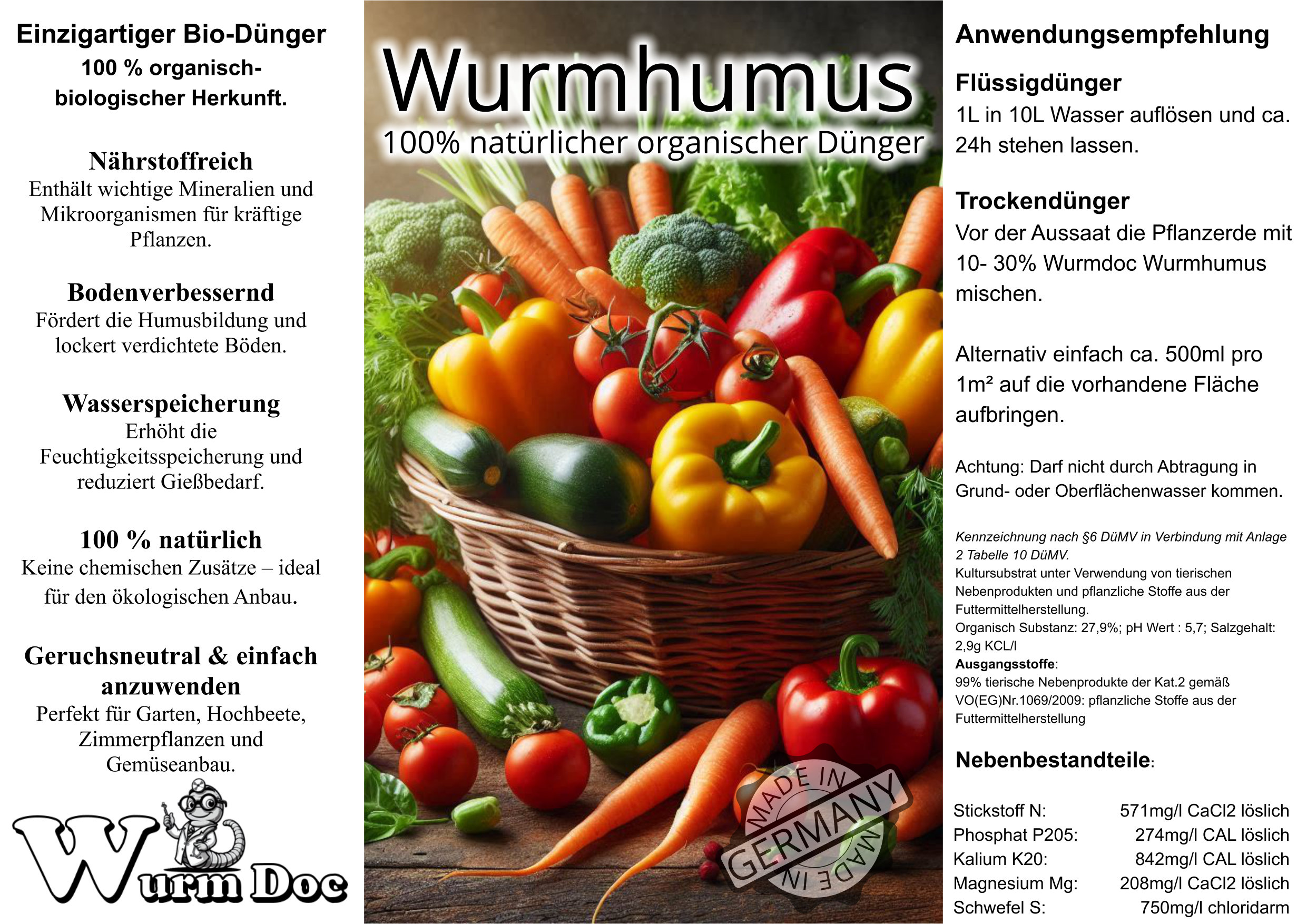 Unser hochwertiger Wurmhumus ist die perfekte Lösung für ein nährstoffreiches und lebendiges Gemüsebeet. Gewonnen aus natürlicher Kompostierung durch Regenwürmer, verbessert dieser organische Dünger nachhaltig die Bodenstruktur, fördert das Bodenleben und sorgt für kräftiges Pflanzenwachstum.